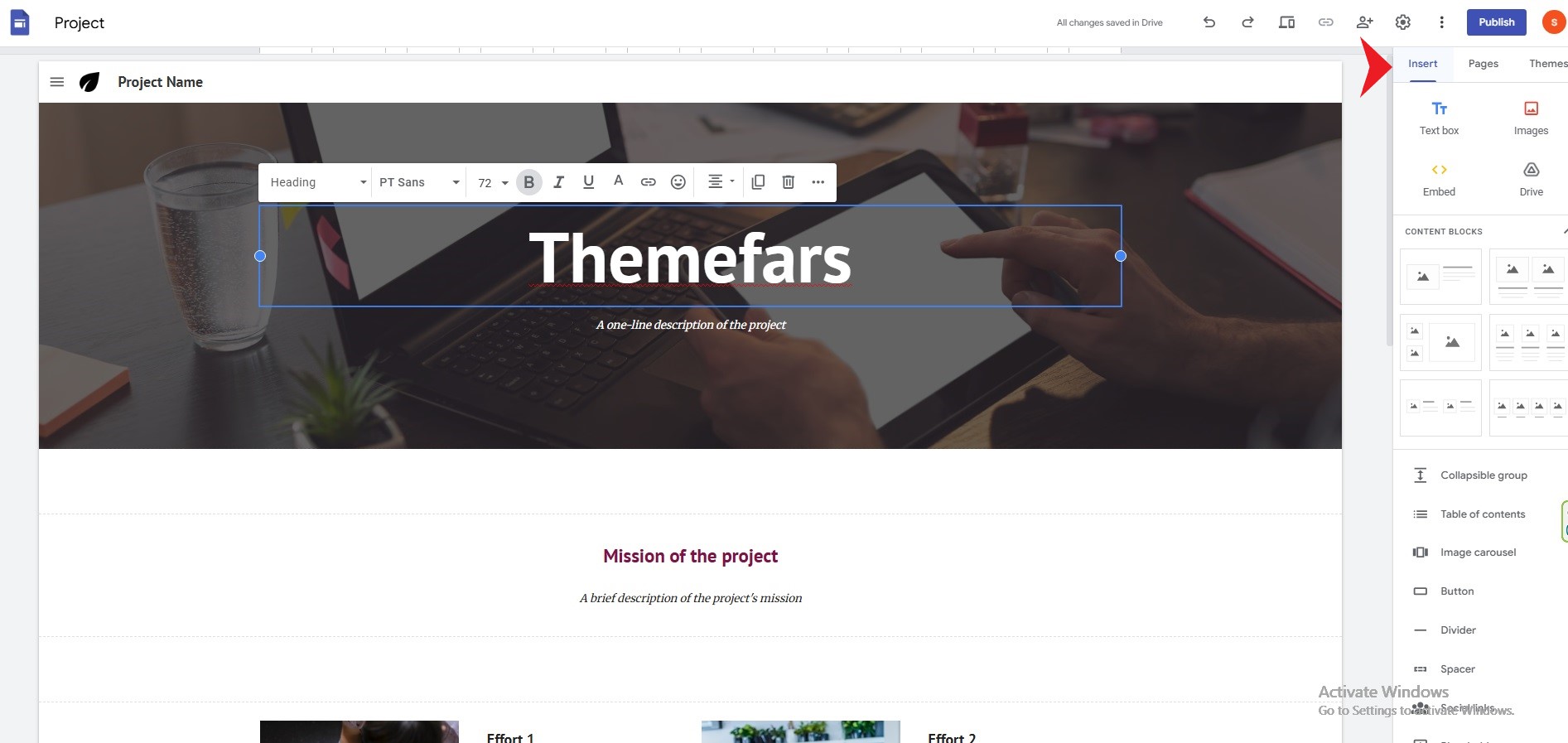 در Google Sites میتوانید بهصورت بصری و بدون هیچ کدنویسی، اجزای صفحه را جابهجا و تنظیم کنید. برای این کار کافی است نشانگر ماوس را روی بخشی از صفحه ببرید تا حاشیهی آن به رنگ آبی دربیاید. حالا میتوانید با click و drag (کشیدن) بخش موردنظر را به هر نقطهی دلخواه منتقل کنید.