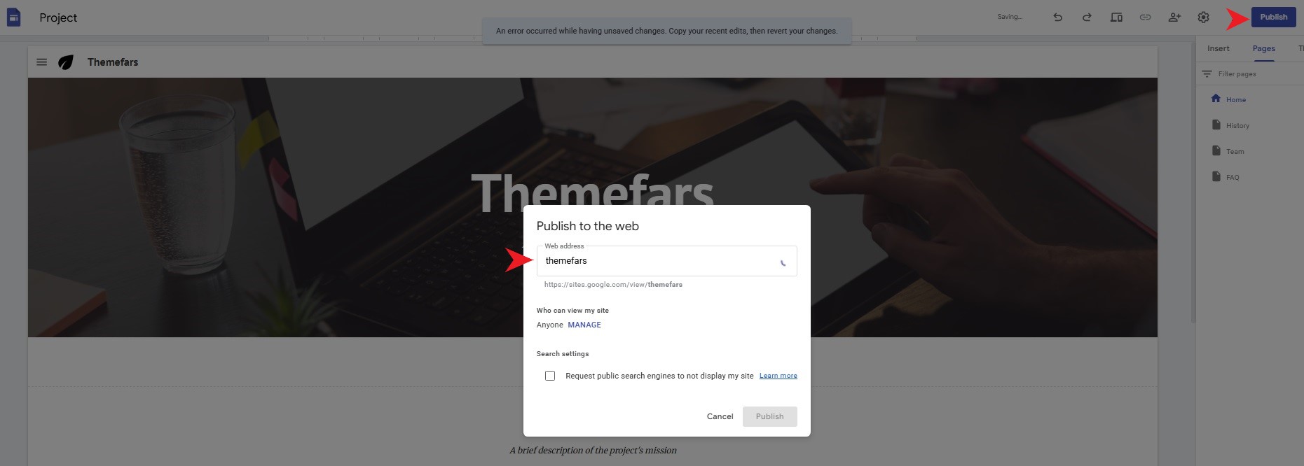 شما میتوانید پس از افزودن صفحه وب و محتوا، وبسایت خود را منتشر کنید. برای انتشار سایت خود، میتوانید روی دکمه publish (انتشار) در نزدیکی سمت راست بالای صفحه وب کلیک کنید.